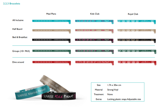 Collaterals Bracelets Estimated reading: 3 minutes 14 views Introduction Each Bracelet color indicates a package that the guest has paid for, to be given out during check-in, assuring it is being worn not just taken.To be placed around the guest’s wrist and excess length cut off Note: The All-Inclusive and Half Board colors are switched with the two brands as per below SUNRISE Resorts Specs All Inclusive Blue Half Board Beige Bed & Breakfast Black Groups (10+ PAX): Green Dine Around Red SUNRISE Grand Select Resorts Specs All Inclusive Biege Half Board Blue Bed & Breakfast Black Groups (10+ PAX): Green Dine Around Red