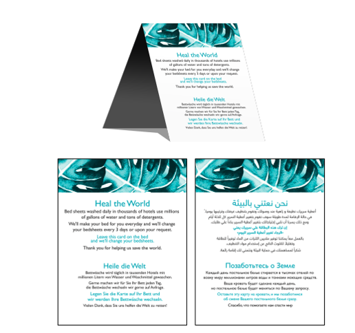 The Environmental Towel Lenin Tent Card is to be placed on the bedside table for the guest to see.