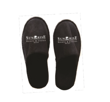 The slippers are to be placed in the closet in the drawer below the hung robes.