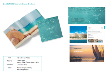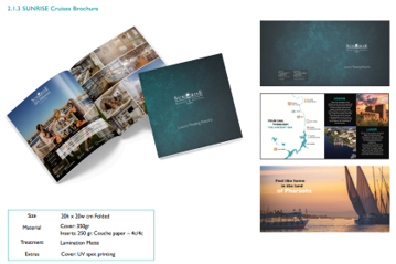 Collaterals Brochure Estimated reading: 2 minutes 437 views Resorts & Cruises Brochure The Sunrise Resorts & Cruises Brochure is to be placed in the rooms/suites and given out as giveaways. Resorts Brochure Specifications Size 15h x 15w cm Folded Material Cover: 350grInserts: 120 gr. Couche paper – 4c/4c Treatment Lamination Matte Extras Cover: UV spot printingDie-cut Separators Cruises Brochure Specifications Size 20h x 20w cm Folded Material Cover: 350grInserts: 250 gr. Couche paper – 4c/4c Treatment Lamination Matte Extras Cover: UV spot printing Tagged:ContentDocNew