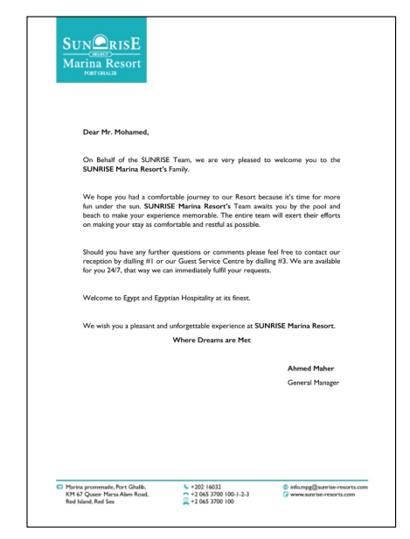 Collaterals Welcome Letter Estimated reading: 2 minutes 16 views Introduction Welcome Letters are to be placed in rooms and suites on the desk/table prior to guest check-in, in order to assure they get a lovely welcoming greeting when they enter the room Welcome Letter Specs Specs Size A4 Material 80 gr. couche paper – 1c/0c Treatment None Extras None